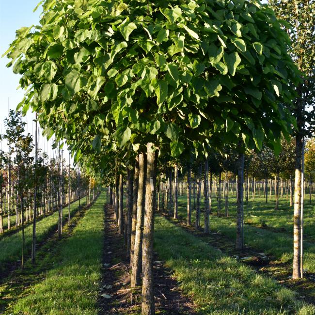 Catalpa bignonioides ‘Nana’ is een compacte, bolvormige boom die vaak op stam wordt geënt. De kroon blijft klein en rond, met grote frisgroene bladeren die in de herfst geel verkleuren. Door zijn geringe omvang en sierlijke vorm is de bolcatalpa zeer populair in tuinen, pleinen en smalle straten. De boom bloeit niet of nauwelijks, waardoor hij onderhoudsvriendelijk en geschikt is voor toepassingen dicht bij terrassen en zitplekken.