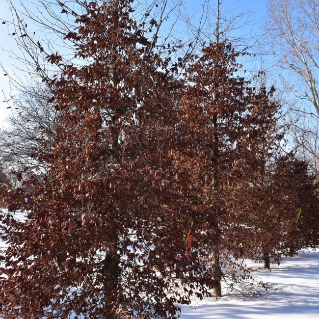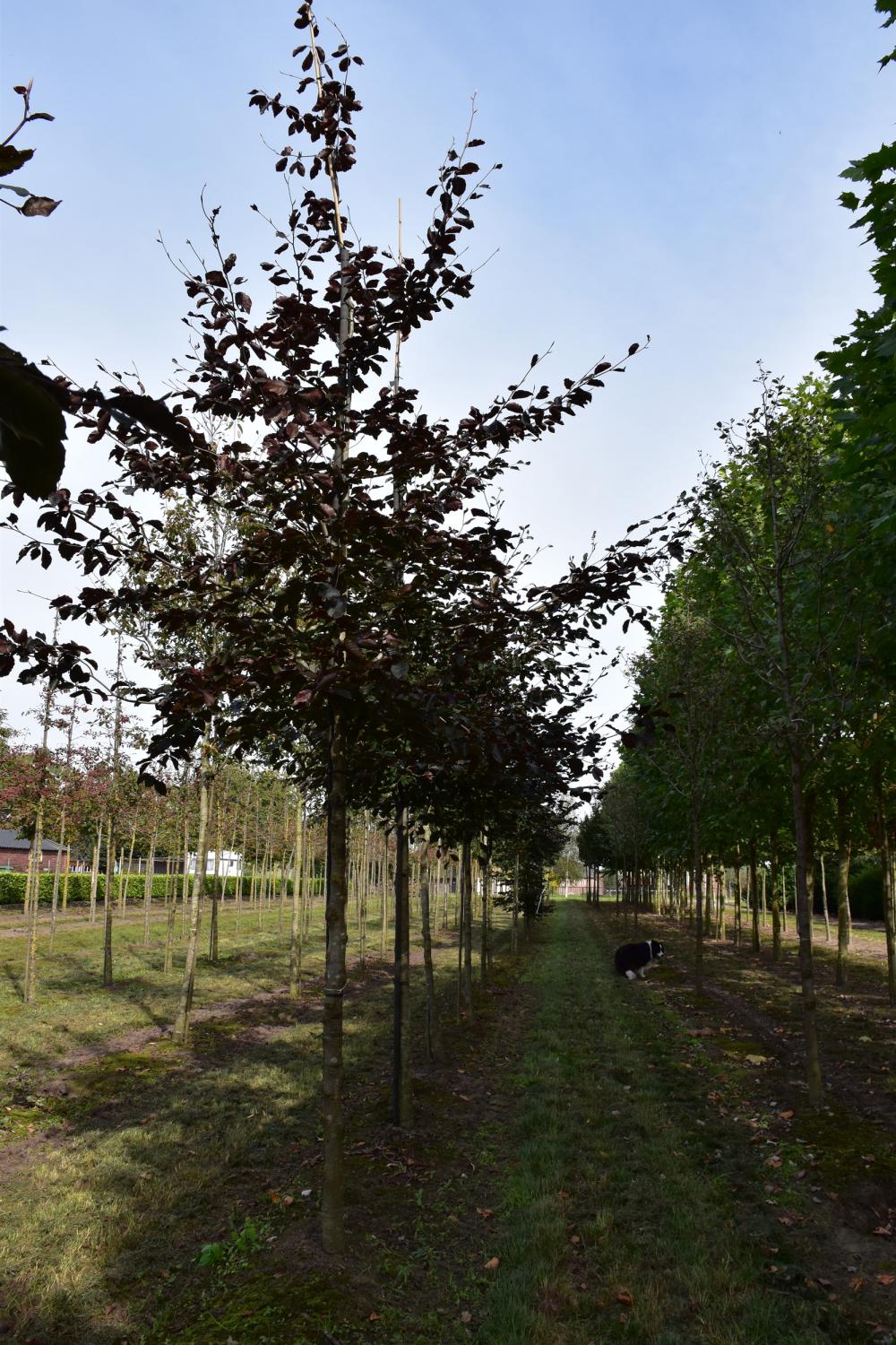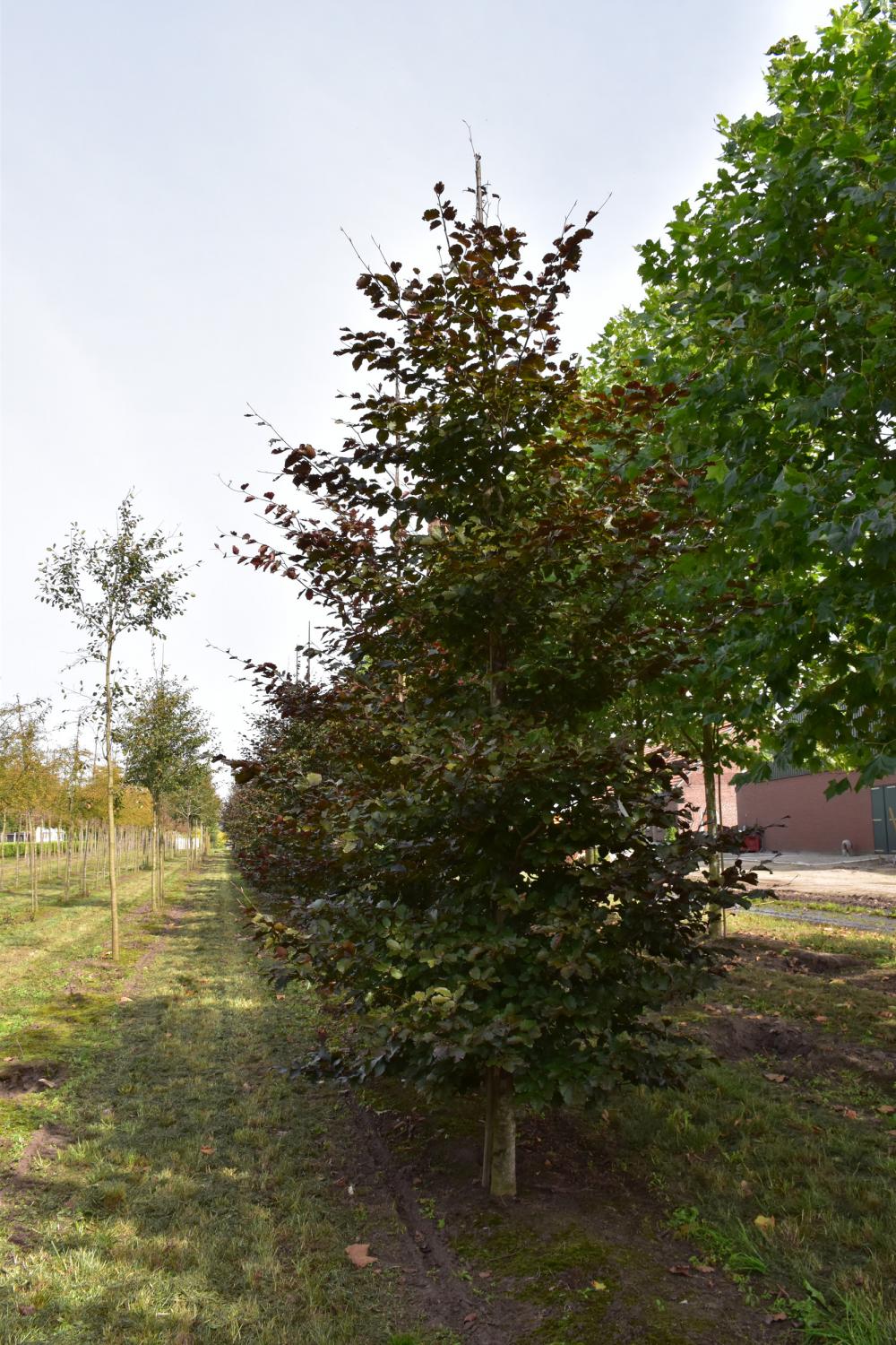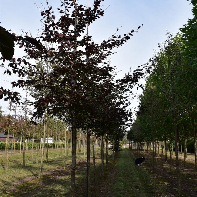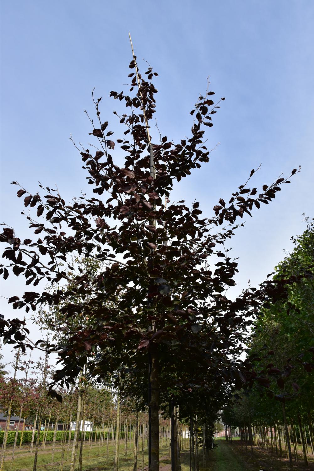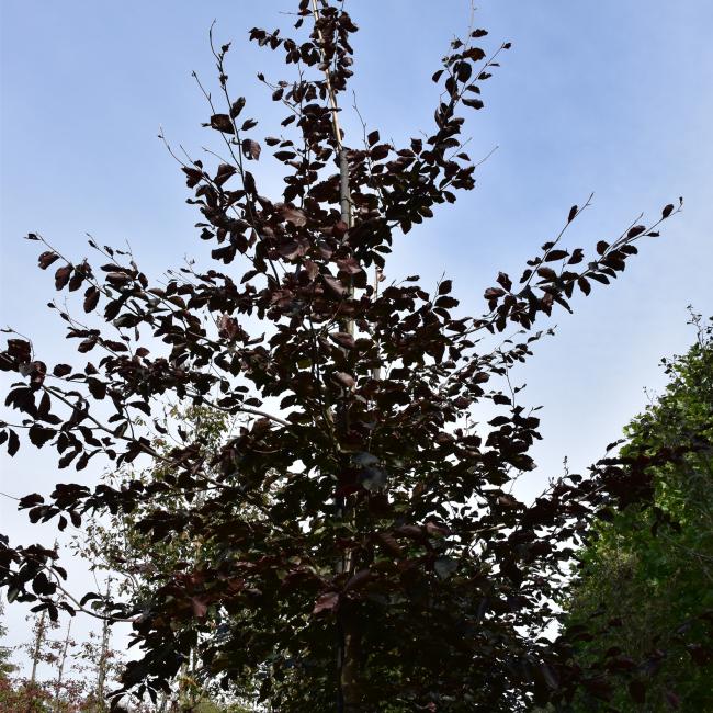 Fagus sylvatica ‘Atropunicea’ is een majestueuze, grote rode beuk die geliefd is om zijn dieprode tot purperbruine bladkleur. De boom vormt een brede, dichte kroon en kan meer dan 25 meter hoog worden. In de herfst verkleurt het blad naar roodbruin. Dankzij zijn indrukwekkende verschijning en sterke kroonstructuur is dit een veel toegepaste boom in parken, lanen en landgoederen.